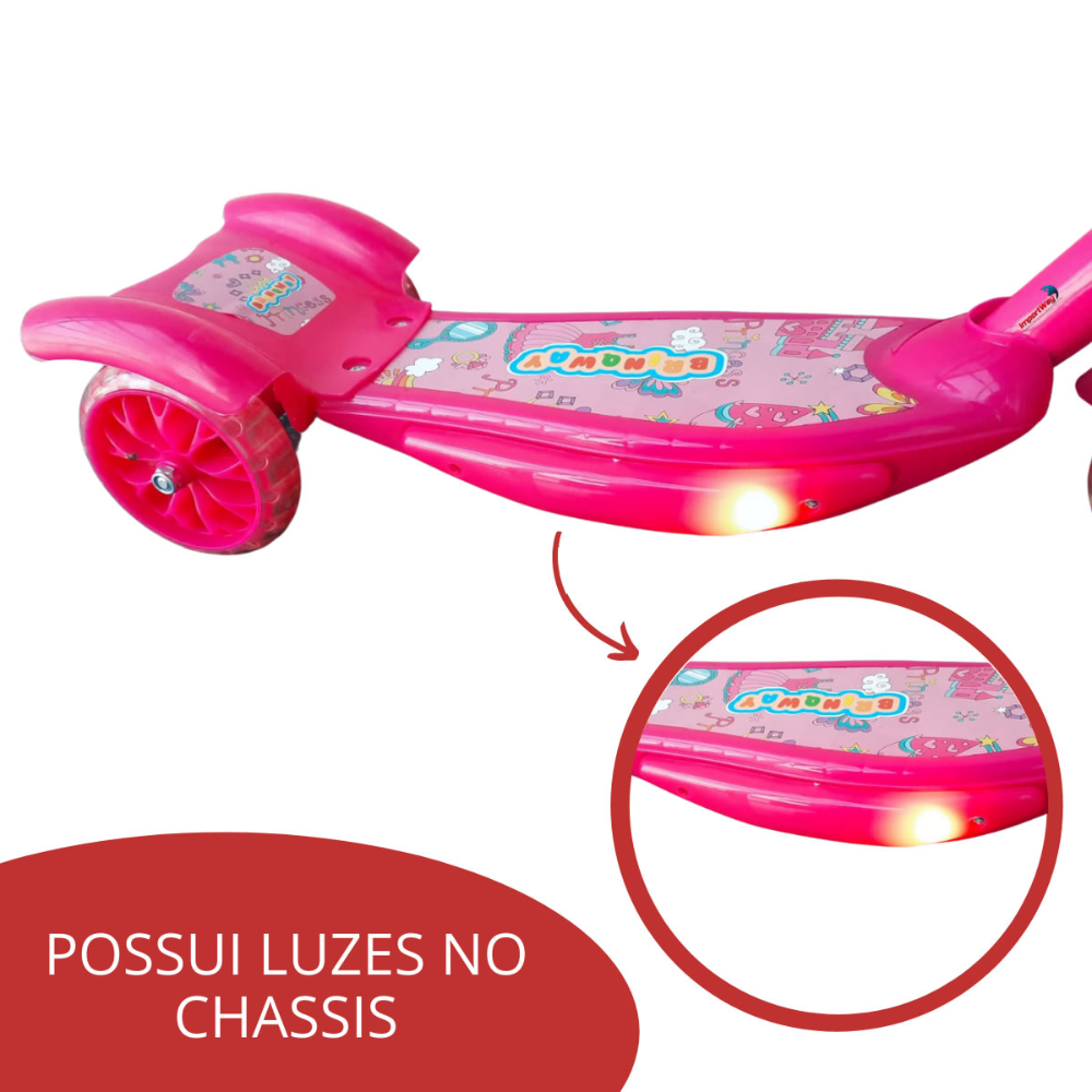 Apresentamos o Patinete Infantil 3 Rodas Importway Rosa, a escolha perfeita para encantar as crianças! Mais do que um simples patinete, este modelo traz música, luzes coloridas e uma prática cesta frontal que transformam cada passeio em uma verdadeira aventura.